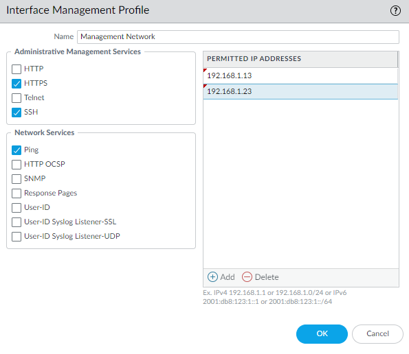 - If you are using a data port as your management interface, after you configure the interface, select NetworkNetwork ProfilesInterface Mgmt and Add an interface management profile to restrict who can access the management interface and what services the interface allows.Do not attach an interface management profile that allows Telnet, SSH, HTTP, or HTTPS to an interface where you have configured a GlobalProtect portal or gateway because this will expose the management interface to the internet. Do not use HTTP or Telnet for any management interface profile because those protocols transmit in cleartext.