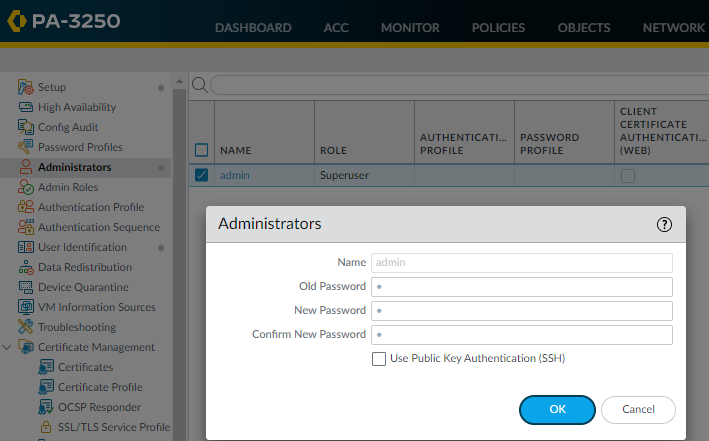 Starting with PAN-OS 9.0.4, the predefined, default administrator password (admin/admin) must be changed on the first login on a device. The new password must be a minimum of eight characters and include a minimum of one lowercase and one uppercase character, as well as one number or special character.