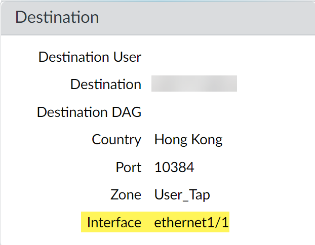 - Click the spyglass icon to the left of any entry to display a detailed log that includes the application’s egress interface listed in the Destination section: