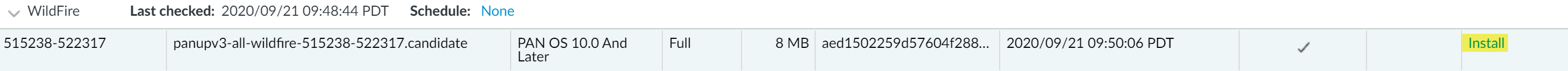Install the content updates.Installation can take up to 10 minutes on a PA-220 firewall and up to two minutes on a PA-5200 Series, PA-7000 Series, or VM-Series firewall.Click the Install link in the Action column. When the installation completes, a check mark displays in the Currently Installed column.