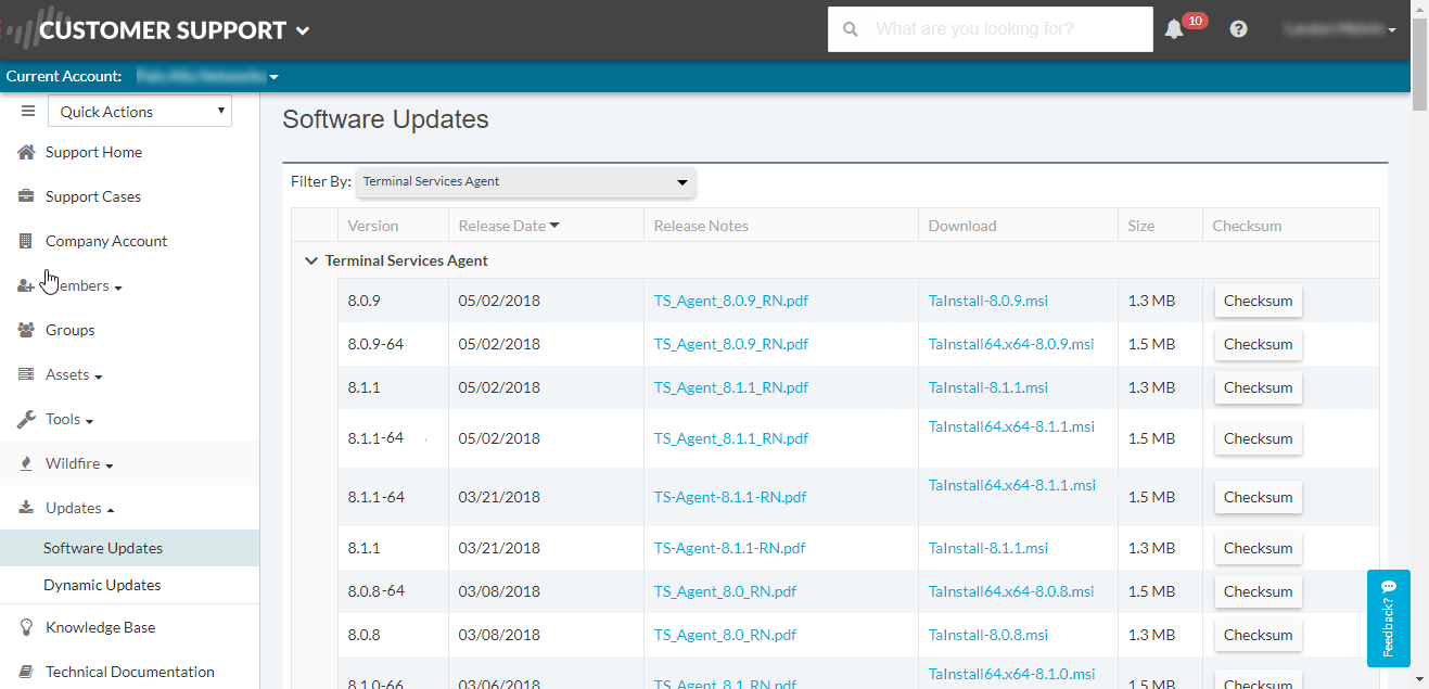 2. Set Filter By to Terminal Services Agent and select the version of the agent you want to install from the corresponding Download column. For example, to download TS agent 9.0, select TaInstall-9.0.msi.