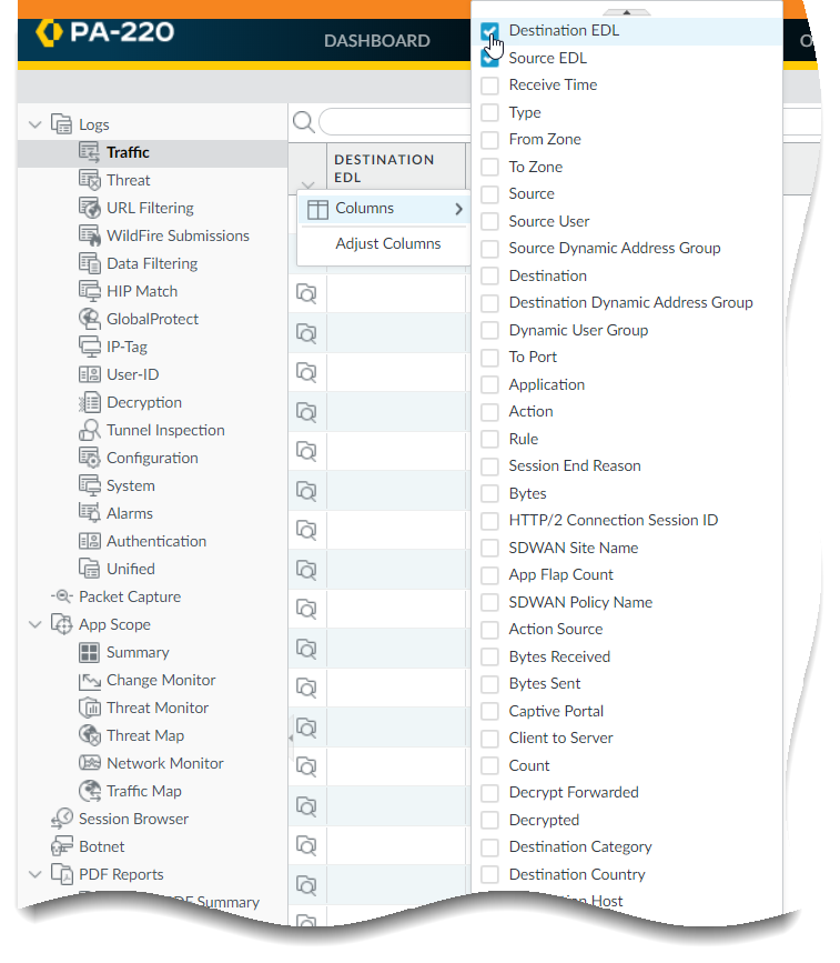 URL URL FilteringCategory View EDL data in reports.PredefinedPredefined reports that include IP addresses now also include columns that identify the EDL in which those addresses reside (if applicable).CustomThe new log fields also display in custom reports if you configure the report to include them.