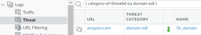 Domain EDLs appear only under the Threat log type.When traffic matches a domain in an EDL, the firewall populates the following fields:- Name—the name of the EDL