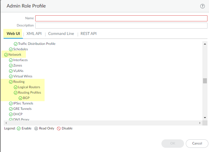 Commit.Select DeviceSetupOperations and Reboot Device.Log back into the firewall.Select Network.Notice the updated menu items, which are more industry-standard and more detailed than the single item (Virtual Routers) on the legacy menu. Routing includes Logical Routers and Routing Profiles, which include BGP. Logical routers in the advanced route engine are equivalent to virtual routers in the legacy route engine.