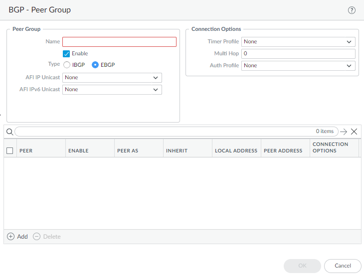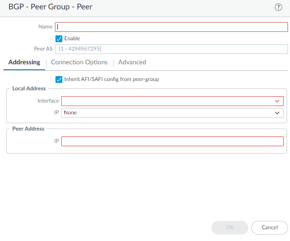 Add a BGP peer to the peer group.- Add a peer by Name and Enable the peer.Enter the Peer AS (autonomous system) to which the peer belongs; range is 1 to 4,294,967,295.Select Addressing.Select Inherit AFI/SAFI config from peer-group or select or create an AFI IP Unicast profile or an AFI IPv6 Unicast profile (Create a BGP Address Family Identifier profile).For Local Address, select the Layer 3 Interface for which you are configuring BGP.Interfaces configured with a static IP address and interfaces configured as a DHCP client are available to select. If you select an interface where DHCP assigns the address, the IP address will indicate None. DHCP will later assign an IP address to the interface; you can see the address when you view More Runtime Stats for the logical router.If the interface has more than one IP address, enter the IP address and netmask you want to use.For Peer Address, enter the IP address of the peer.