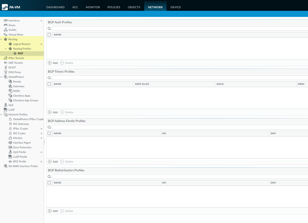 Click OK to save the BGP redistribution settings.Create a BGP Authentication profile to apply to a BGP peer group or peer.- Select NetworkRoutingRouting ProfilesBGP.