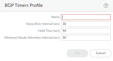 Add a BGP Authentication Profile by Name (a maximum of 31 characters).Enter the Secret and Confirm Secret. The Secret is used as a key in MD5 authentication.Click OK.Create a BGP Timers profile to apply to a BGP peer group or peer.- Select NetworkRoutingRouting ProfilesBGP.Add a BGP Timers Profile by Name (a maximum of 31 characters).