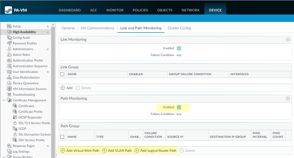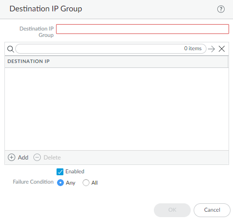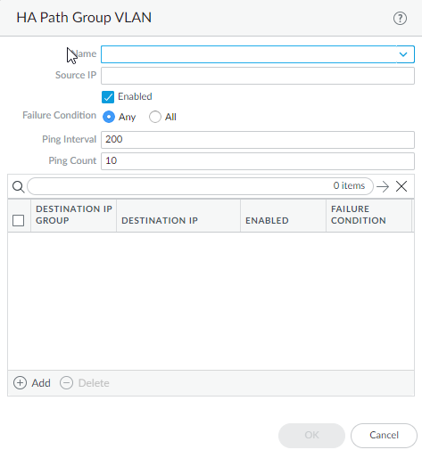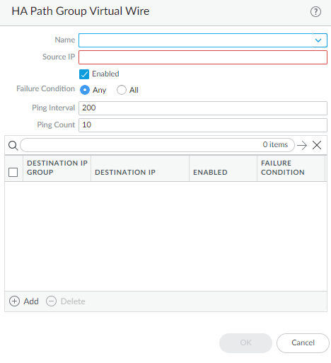 Configure path monitoring for the static route; you can monitor up to 128 static routes.- Select Path Monitoring and Enable.Failure Condition determines whether path monitoring for the static route is based on one (any) or all monitored destinations. Select whether Any or All of the monitored destinations for the static route must be unreachable by ICMP for the firewall to remove the static route from the RIB and FIB and add the static route that has the next lowest metric (going to the same destination) to the FiB.Select All to avoid the possibility of any single monitored destination signaling a route failure when the destination is simply offline for maintenance, for example.(Optional) Specify the Preemptive Hold Time (min), the number of minutes a downed path monitor must remain in Up state before the firewall reinstalls the static route into the RIB; range is 0 to 1,440; default is 2. A setting of 0 (zero) causes the firewall to reinstall the route into the RIB immediately upon the path monitor coming up.The path monitor evaluates all of its monitored destinations for the static route and comes up based on the Any or All failure condition. If a link goes down or flaps during the hold time, when the link comes back up, the path monitor resumes and the Preemptive Hold Time is reset, causing the timer to restart from zero.Add a path monitoring destination by Name.Enable the path monitoring destination.For Source IP, select the IP address that the firewall uses in the ICMP ping to the monitored destination: