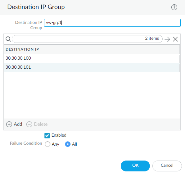 Configure your destination group by adding destination IP addresses and setting the appropriate failure condition.