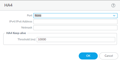 Configure the HA4 link.- Select HA Communications and in the Clustering Links section, edit the HA4 section.Select the interface you configured as an HA interface to be the Port for the HA4 link; for example, ethernet1/1.Enter the IPv4/IPv6 Address of the local HA4 interface.Enter the Netmask.(Optional) Configure the HA4 Keep-alive Threshold.
