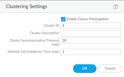 - Select DeviceHigh AvailabilityGeneral and edit the Clustering Settings.Enable Cluster Participation.Enter the Cluster ID and configure the Clustering Settings.