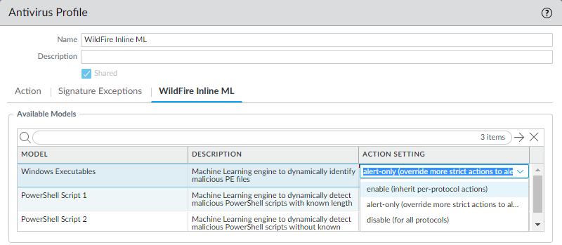 - Select WildFire Inline ML and apply an Action Setting for each WildFire inline ML model. This enforces WildFire inline ML Actions settings for each protocol on a per-model basis. There are three classification engines: Windows Executables, PowerShell Scripts 1, and PowerShell Scripts 2.