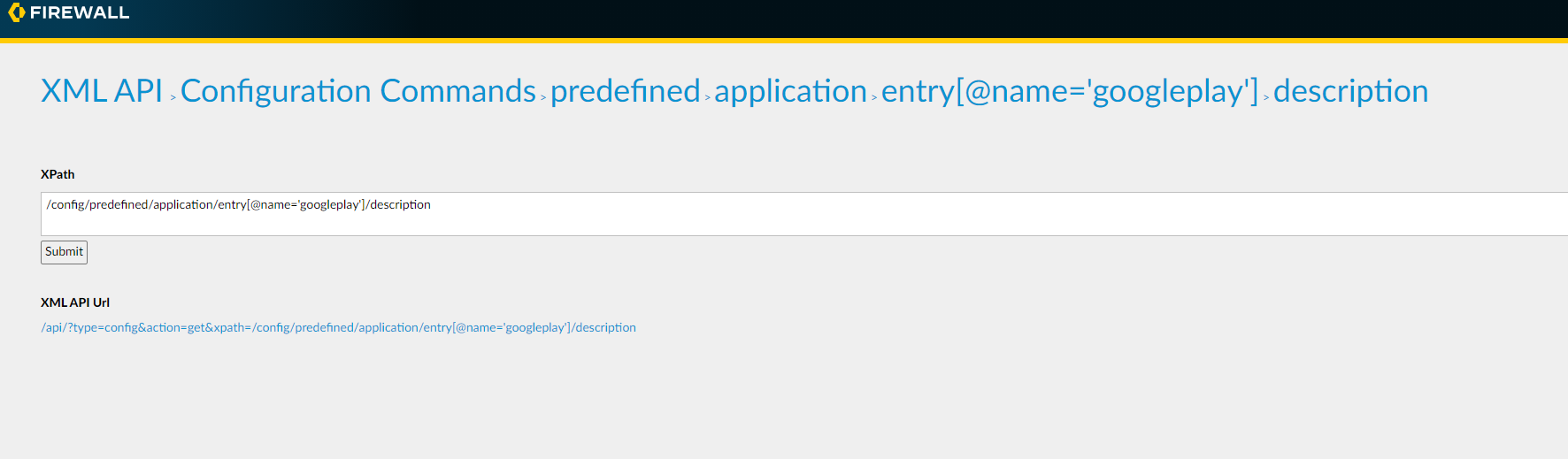 Each firewall and Panorama provides an API browser that is accessible from your web browser. The API browser lets you navigate through and view the corresponding XPath and API URL.