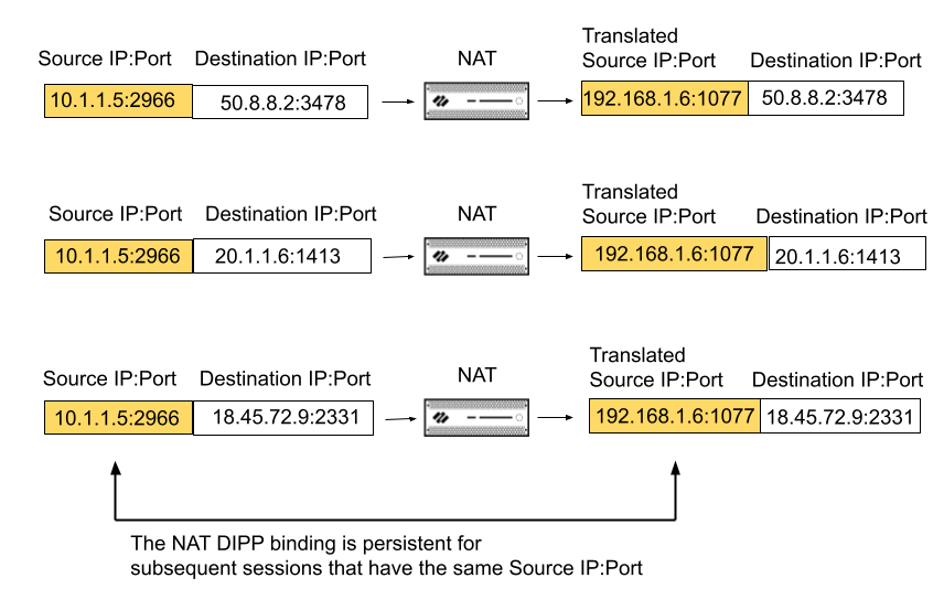 In this example, original source IP address/port 10.1.1.5:2966 is bound to the translated source IP address/port 192.168.1.6:1077 in Session 1. That binding is persistent in Session 2 and Session 3, which have the same original source IP address/port as Session 1, but different destination addresses. The persistence of the binding ends after all of the sessions for that source IP address/port pair have ended.