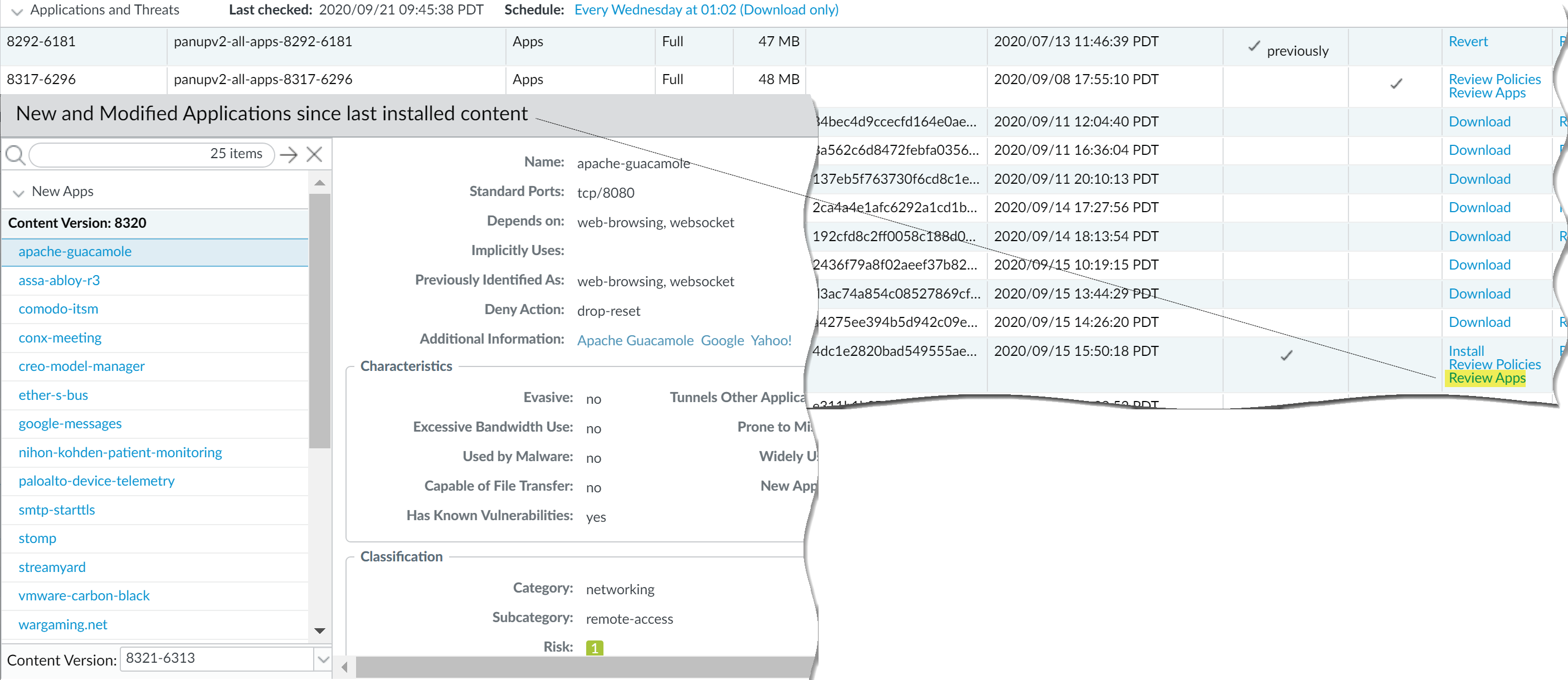 The Notes section of Content Release Notes highlights future updates that Palo Alto Networks has identified as possibly significantly impacting coverage: for example, new App-IDs or decoders. Check for these future updates, so that you can account for any policy impact in advance of the release. - To mitigate any impact to security policy enforcement that is associated with enabling new application and threat signatures, stagger the roll-out of new content. Provide new content to locations with less business risk (fewer users in satellite offices) before deploying them to locations with more business risk (such as locations with critical applications). Confining the latest content updates to certain firewalls before deploying them across your network also makes it easier to troubleshoot any issues that arise. You can use Panorama to push staggered schedules and installation thresholds to firewalls and device groups based on organization or location (Use Panorama to Deploy Updates to Firewalls).