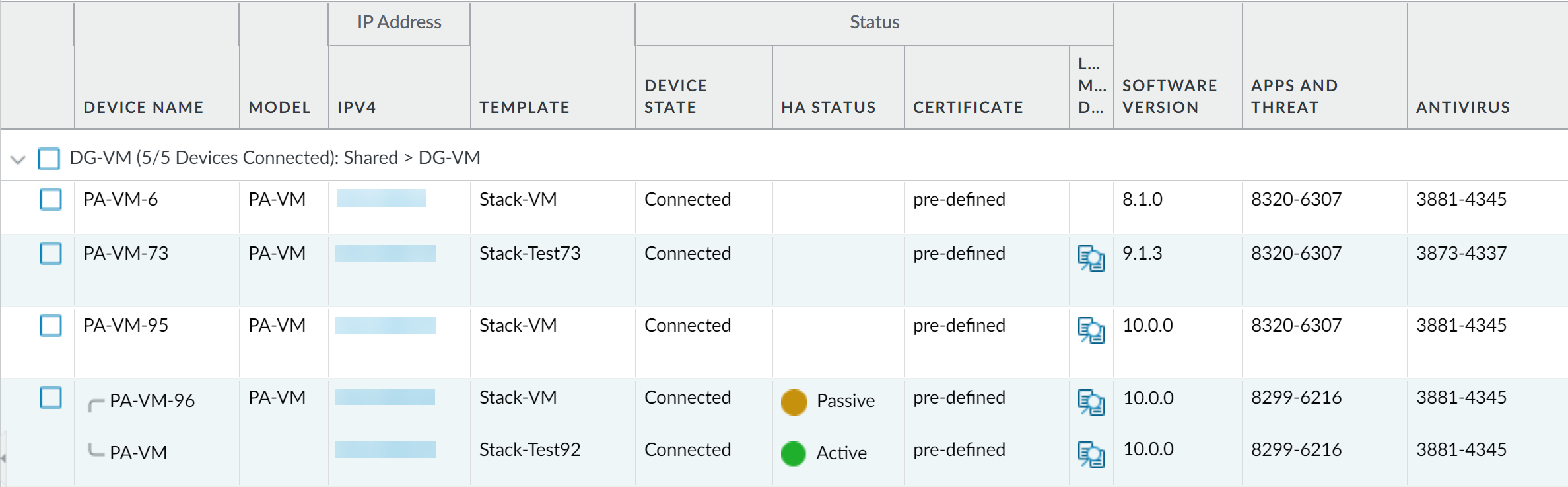 - On Panorama, select PanoramaManaged Devices.Locate the firewalls and review the content and software versions in the table.For HA firewalls, you can also verify that the HA Status of each peer is as expected.