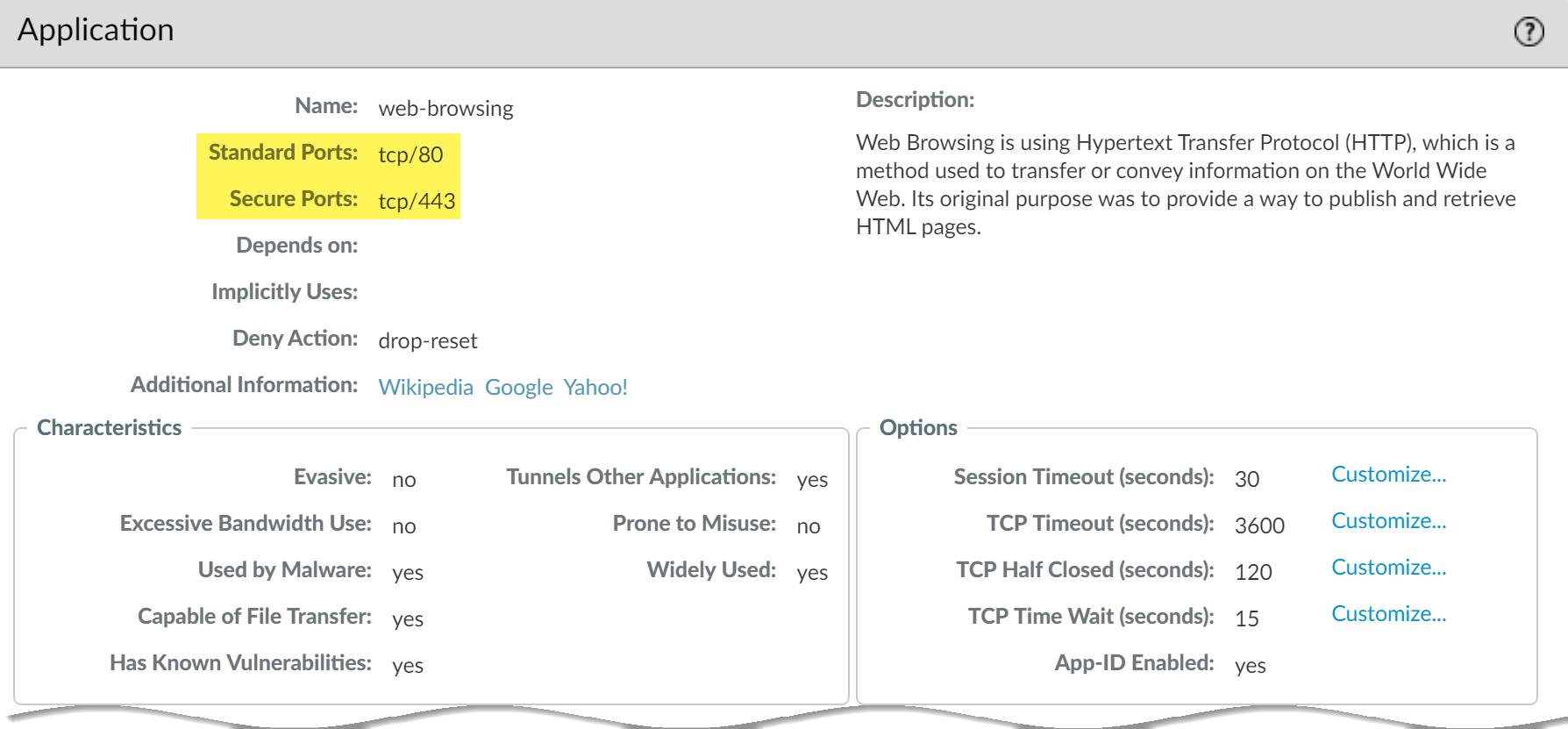 To see the ports that an application uses by default, you can visit Applipedia or select ObjectsApplications. Application details include the application’s standard port—the port it most commonly uses when in cleartext. For web-browsing, SMTP, FTP, LDAP, POP3, and IMAP details also include the application’s secure port—the port the application uses when encrypted.