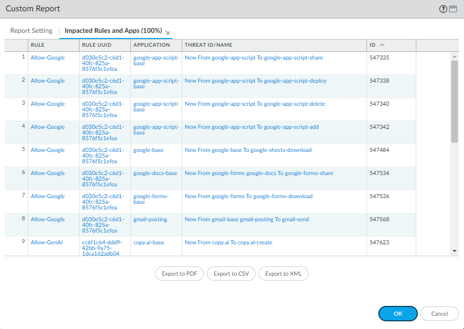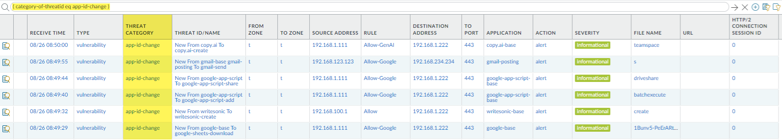 Search for activity on the firewall for queries that match against the App-ID TSID criteria. You can manually peruse through the logs or you can create a custom report using the same Query Builder attributes used for activity searches. You can then use the custom report / threat log results to modify your existing Security policy rules in preparation for the new and updated App-IDs scheduled for inclusion in the following month's release of the Applications and Threats content update. You can track affected rules by cross referencing the Rule with the detected App-ID TSIDs in your network. If you use Panorama to manage your firewalls, you can use the global search functionality (located in the top-right) to find the affected rule(s). Selecting the resulting Security Rule will bring you to that policy rule for configuration.You can cross reference affected rules by populating the threat logs and custom reports with the Rule and Rule UUID data columns.- Monitor activity on the firewall:If you are using the Strata Cloud Manager Log Viewer to review your firewall logs, you can use the following search query: Threat Category = 'app-id-change'