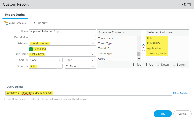 - Define the Time Frame for the report (Last 7 Days is generally recommended; however, also consider using a time frame most relevant since you downloaded and installed the latest Application and Threats content update, which contain TSIDs).