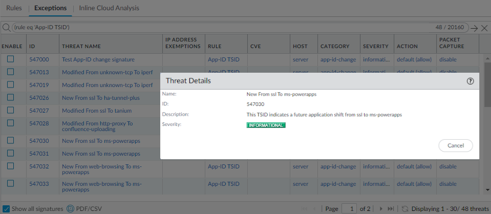 Next Steps:- The Threat ID/Name value in the App-ID TSID match results describe the nature of the updated App-ID entry after you install the upcoming Applications and Threats content update. Depending on the type of the update, this could be a Modified or New App-ID, as indicated by the description. After reviewing the information, you can update your security policies to include these modified or new App-IDs, as appropriate for your organization's network usage policies. Refer to Manage New and Modified App-IDs for more information.