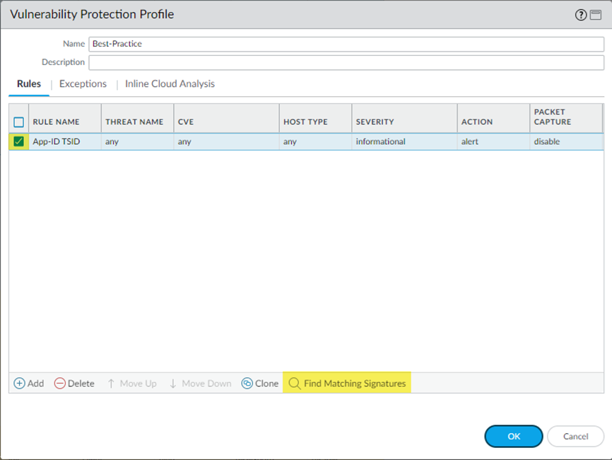 Test the new rule by selecting the rule and Find Matching Signatures. This will return currently available App-ID TSIDs. If you do not see any results or the results do not appear to indicate App-ID TSIDs, verify that app-id-change has been selected in the Vulnerability Protection Rule.