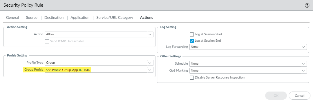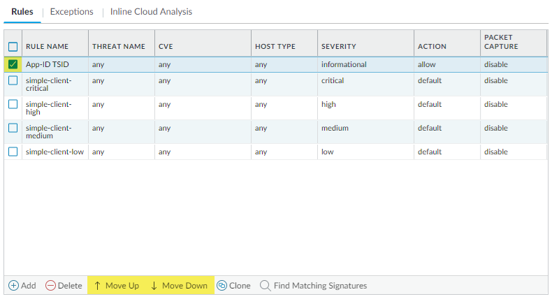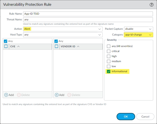 - Add a new Vulnerability Protection Rule and configure it using the following settings:Palo Alto Networks recommends using the following settings to enable matching App-ID TSIDs in order to generate corresponding Threat Logs for future App-ID changes.