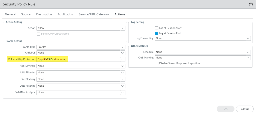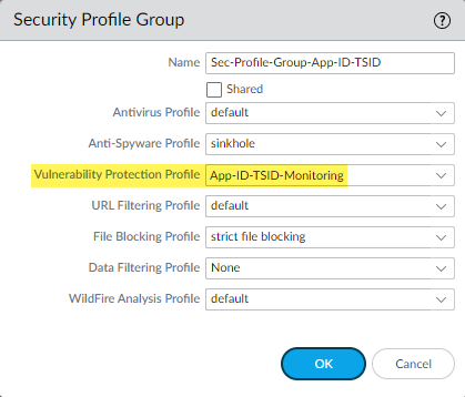 Click OK to save your Vulnerability Protection profile.Configure your Vulnerability Protection profile to the Security Policy rule(s) you want to monitor for potential App-ID changes. This can be done by applying the specific Vulnerability Protection profile in the Security Policy rule(s) or in a Security Profile Group and using that group in the Security Policy rule(s), based on how your policies are constructed.- Vulnerability Profile applied directly to a Security Policy rule: