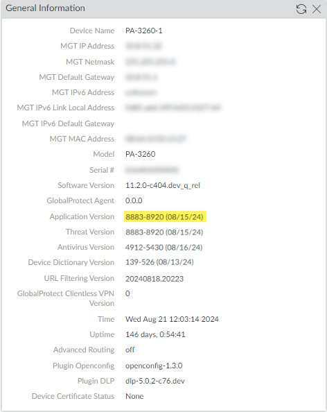 Verify that Applications and Threats content update 8783 or later is installed on your firewall to access the new Vulnerability Signature category. To view the currently installed Application and Threats content version, select Dashboard and refer to the Application Version entry located in the Generation Information pane.