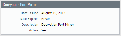Install the Decryption Port Mirror license on the firewall.- From the firewall web interface, select DeviceLicenses.Click Retrieve license keys from license server.Verify that the license has been activated on the firewall.