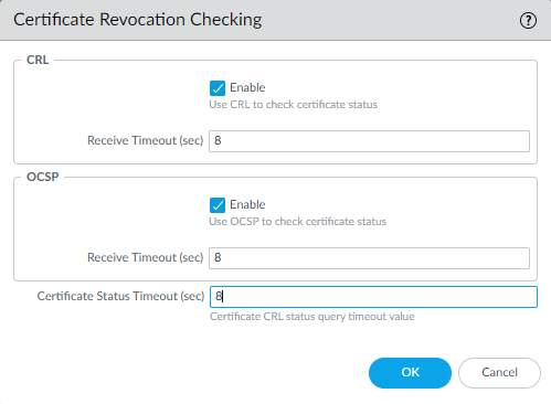• Block sessions on certificate status check timeout—Whether to block sessions if the status check times out depends on your company’s security compliance stance because it’s a tradeoff between tighter security and a better user experience. Certificate status verification examines the Certificate Revocation List (CRL) on a revocation server or uses Online Certificate Status Protocol (OCSP) to find out if the issuing CA has revoked the certificate and the certificate should not be trusted. However, revocation servers can be slow to respond, which can cause the session to timeout and the firewall to block the session even though the certificate may be valid. If you Block sessions on certificate status check timeout and the revocation server is slow to respond, you can use DeviceSetupSessionDecryption Settings and click Certificate Revocation Checking to change the default timeout value of five seconds to another value. For example, you could increase the timeout value to eight seconds, as shown in the following figure. Enable both CRL and OCSP certificate revocation checking because server certificates can contain the CRL URL in the CRL Distribution Point (CDP) extension or the OCSP URL in the Authority Information Access (AIA) certificate extension.