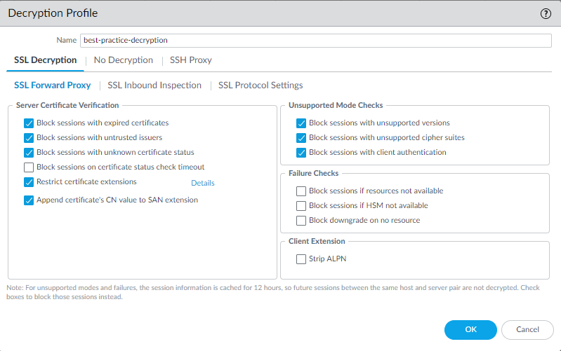 The SSL Forward Proxy Decryption profile blocks risky outbound sessions, verifies certificates, and provides session failure checks.