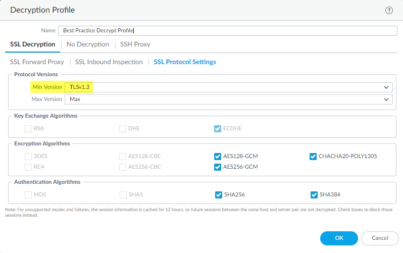 specify TLSv1.3 support in the Decryption profile, then PAN-OS defaults