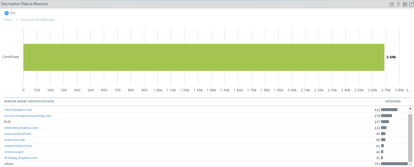 2. Click the green bar next to Certificate to see which hosts (SNIs) experienced certificate errors and see a list of hosts that experienced the largest number of certificate errors.