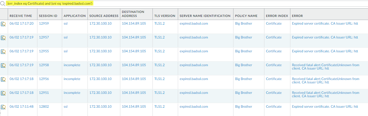 To filter for the certificate errors that a specific host received, add that SNI to the query instead of adding error message text. For example, to find all certificate errors for expired.badssl.comm use the query (err_index eq Certificate) and (sni eq ‘expired.badssl.com’):
