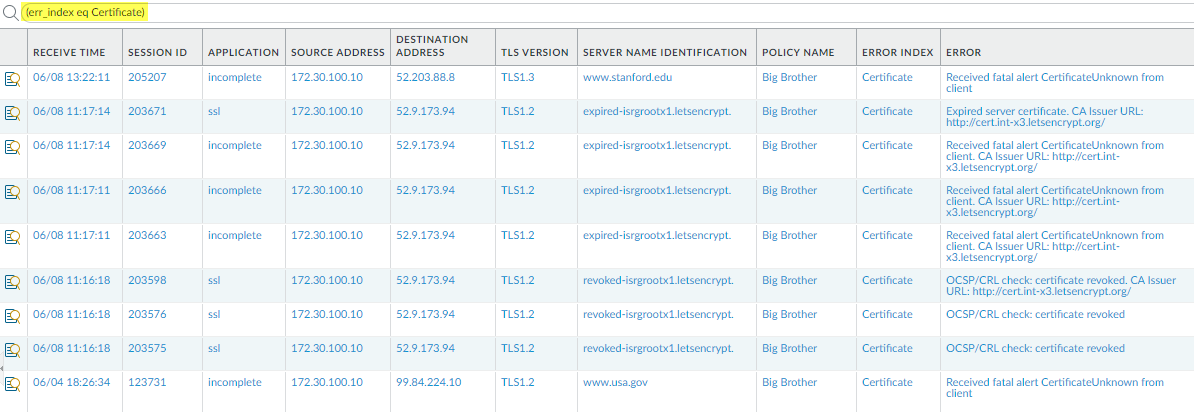 Use the query (err_index eq Certificate) to filter the Decryption logs to view all Decryption sessions that experienced certificate errors.