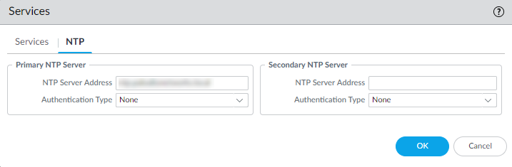(Optional) Enter a Secondary NTP Server address.(Optional) To authenticate time updates from the NTP server(s), for Authentication Type, select one of the following for each server:- None—(Default) Disables NTP authentication.