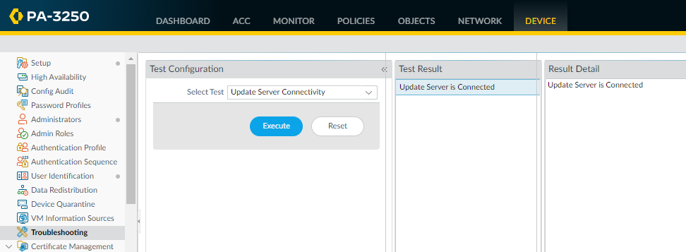 - Use update server connectivity test to verify network connectivity to the Palo Alto Networks Update server as shown in the following example: