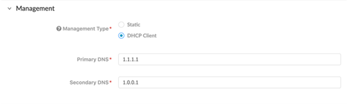 Selecting DHCP Client only requires that you enter the Primary DNS and Secondary DNS. A device configured in DHCP client mode will ensure the management interface receives an IP address from the local DHCP server, or it will fill out all the parameters if they are known.