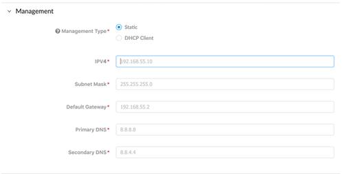 Under Management, select either Static or DHCP Client for your Management Type.Selecting Static will require you fill out the IPV4, Subnet Mask, and Default Gateway fields.
