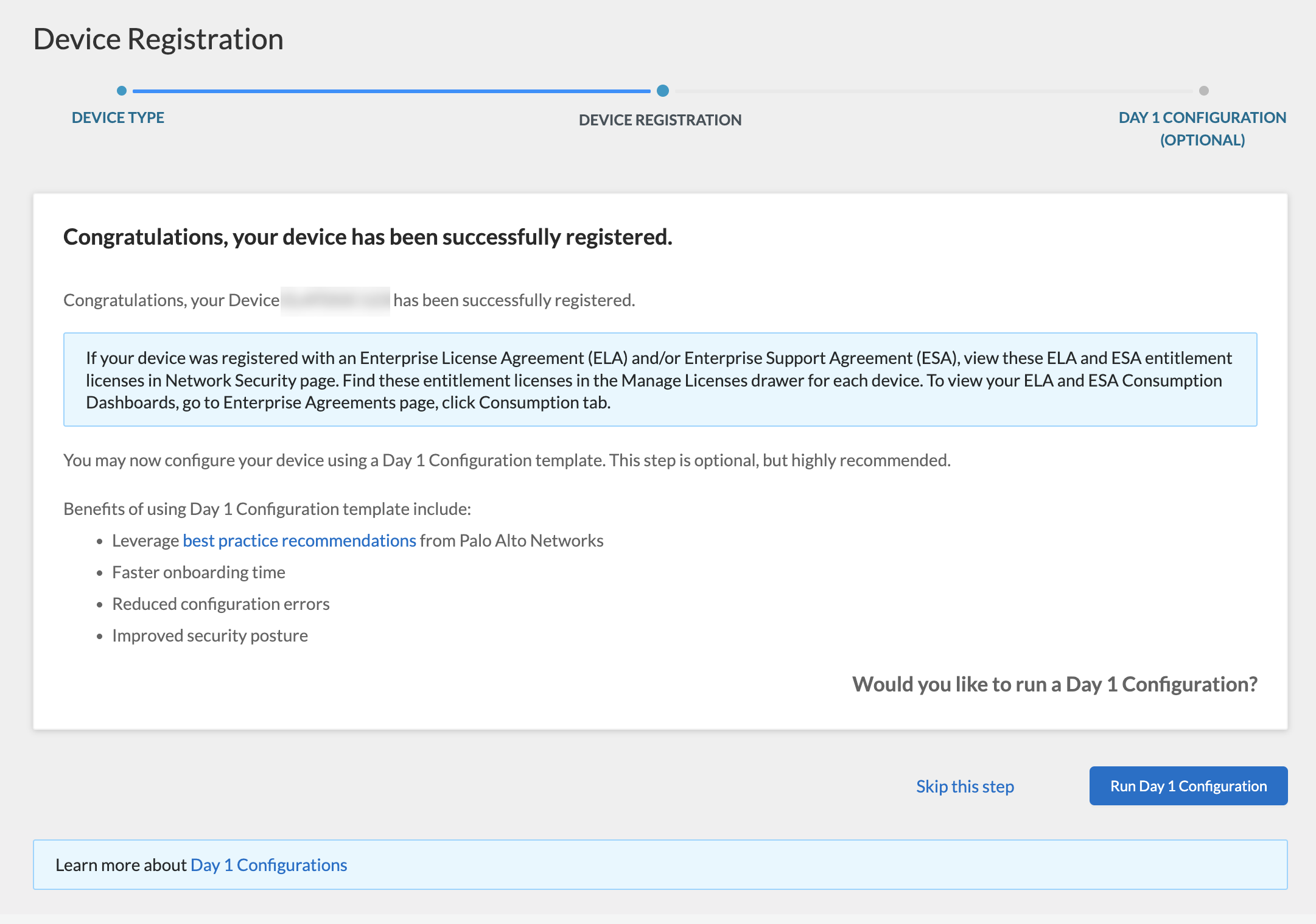 After you register your firewall, you have the option of running Day 1 Configuration. The Day 1 Configuration tool provides configuration templates informed by Palo Alto Networks best practices, which you can use as a starting point to build the rest of your configuration.The benefits of Day 1 Configuration templates include:- Faster implementation time