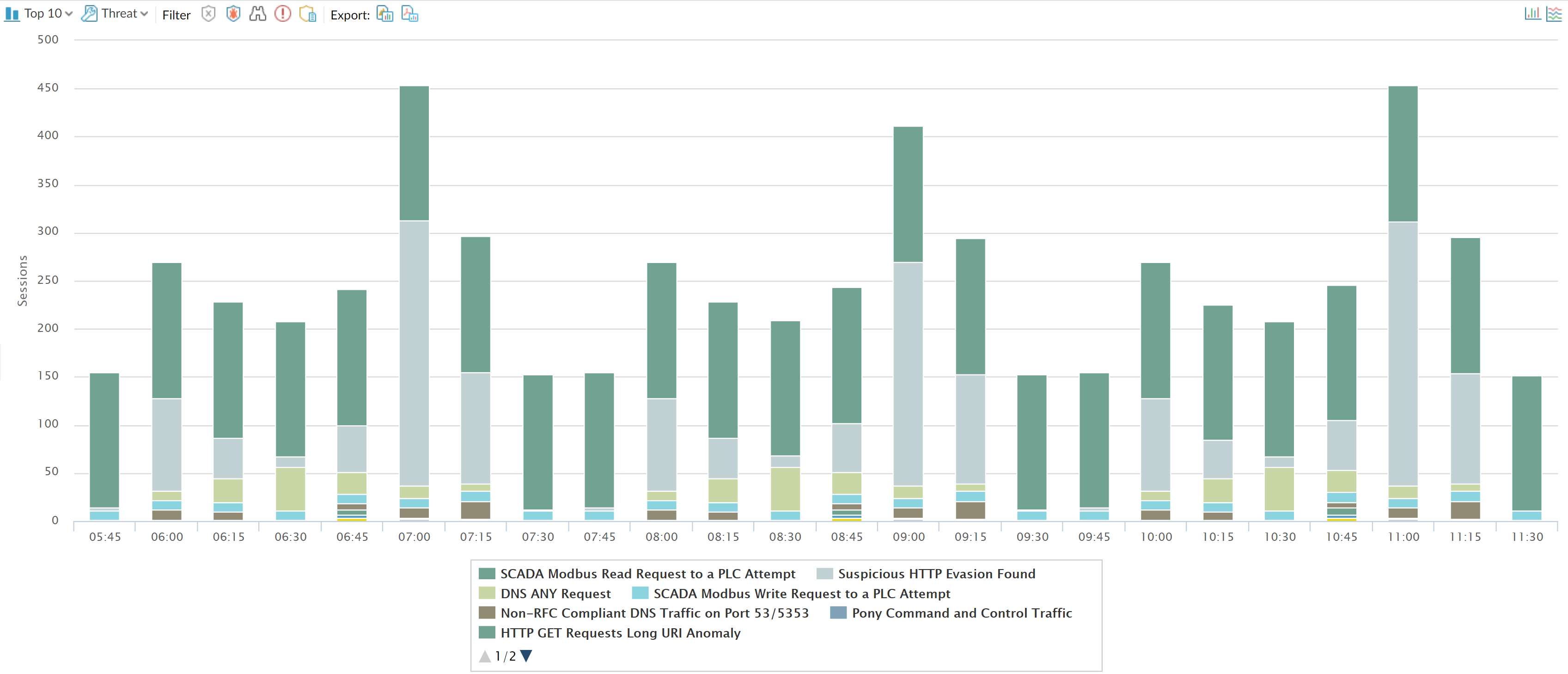 Each threat type is color-coded as indicated in the legend below the chart. The Threat Monitor report contains the following buttons and options.