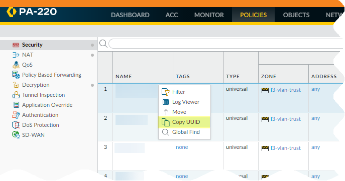 Copy the UUID for a log or policy rule.Copying the UUID allows you to paste the UUID in to searches, the ACC, custom reports, filters, and anywhere else you want to locate a rule identified by that UUID.- Select the ellipses that display when you move your cursor over the entry in the Rule UUID column.