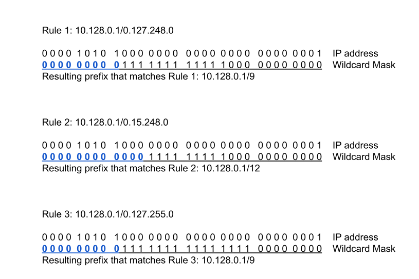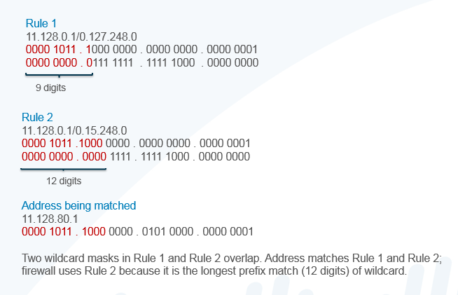 • If an address matches rules that have overlapping wildcard masks, the firewall chooses the match to the longest prefix in the wildcard mask, as shown in the following figure: