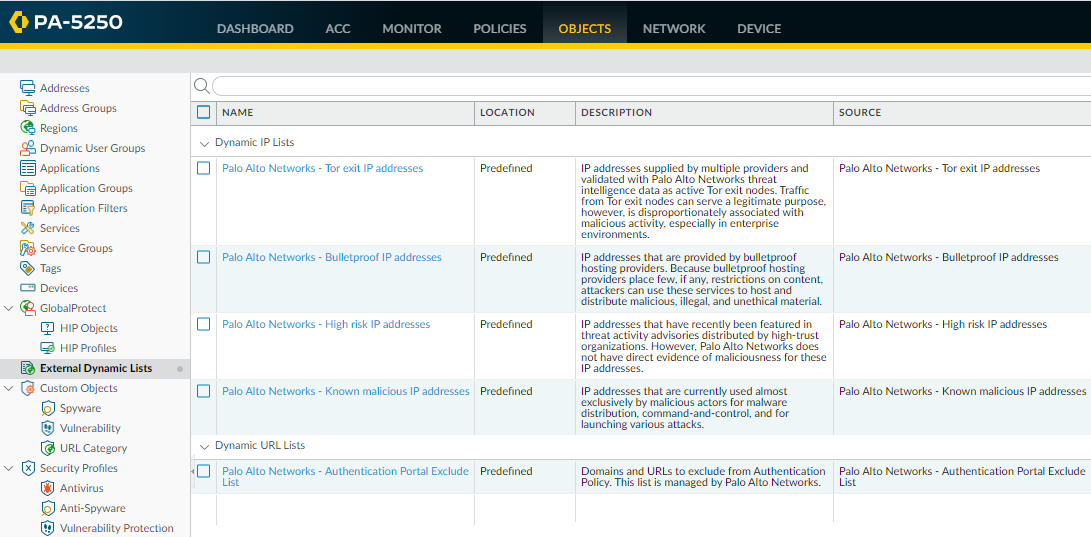 The firewall receives updates for these feeds in content updates, allowing the firewall to automatically enforce policy based on the latest threat intelligence from Palo Alto Networks. You cannot modify the contents of the built-in lists. Use them as-is (see Enforce Policy on an External Dynamic List), or create a custom external dynamic list that uses one of the lists as a source (see Configure the Firewall to Access an External Dynamic List) and exclude entries from the list as needed.
