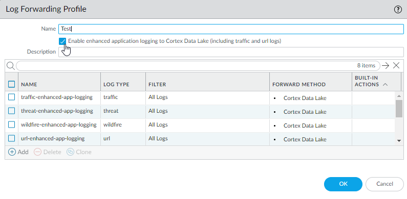 To add the forwarding of EALs to an existing Log Forwarding profile that doesn’t already have it, choose it from the Log Forwarding Profile list, select Enable Enhanced IoT Logging and then OK.