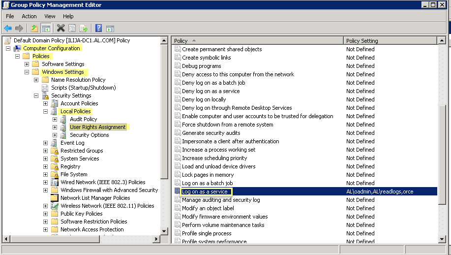 1. Select Group Policy Management EditorDefault Domain PolicyComputer ConfigurationPoliciesWindows SettingsSecurity SettingsUser Rights Assignment.