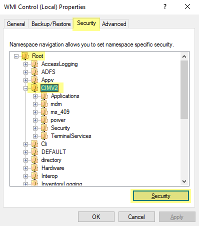 3. Select the Security tab, then select RootCIMV2, and click the Security button.