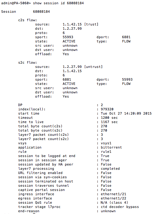 To see whether a session is offloaded or not, use the show session id <session-id> operational command in the CLI as shown in the following example. The layer7processing value indicates completed for sessions offloaded or enabled for sessions not offloaded.