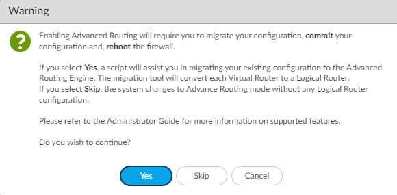 Select Yes to have the migration script convert each virtual router to a logical router and migrate your configuration to the advanced routing engine. (Select Skip to restart the system with an empty configuration. Select Cancel to cancel the process to enable Advanced Routing.)