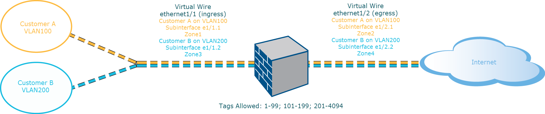 Virtual Wire to separate CustomerA and CustomerB traffic. Make sure